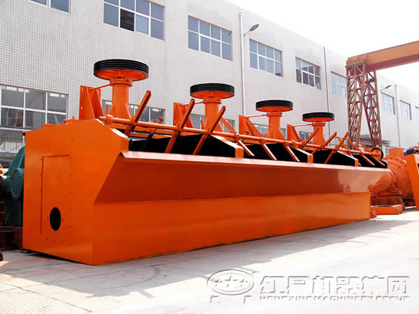 開采的礦石先由顎式破碎機(jī)進(jìn)行初步破碎,在破碎至合理細(xì)度后經(jīng)由提升機(jī)、振動(dòng)給料機(jī)均勻送入球磨機(jī),由球磨機(jī)對礦石進(jìn)行粉碎、研磨。經(jīng)過球磨機(jī)研磨的礦石細(xì)料進(jìn)入下一道工序:分級(jí)。螺旋分級(jí)機(jī)借助固體顆粒的比重不同而在液體中沉淀的速度不同的原理,對礦石混合物進(jìn)行洗凈、分級(jí)。礦物顆粒在被送入浮選機(jī),根據(jù)不同的礦物特性加入不同的藥物,使得所要的礦物質(zhì)與其他物質(zhì)分離開。