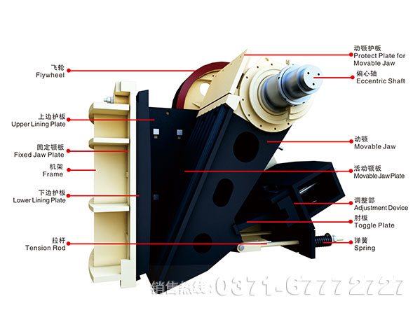 該機(jī)械的工作方式為曲動(dòng)擠壓型,電動(dòng)機(jī)驅(qū)動(dòng)皮帶和皮帶輪,通過偏心軸使動(dòng)顎上下運(yùn)動(dòng),當(dāng)動(dòng)顎上升時(shí)肘板與動(dòng)顎間夾角變大,從而推動(dòng)動(dòng)顎板向固定顎板接近,與其同時(shí)物料被壓碎或劈碎,達(dá)到破碎的目的;當(dāng)動(dòng)顎下行時(shí),肘板與動(dòng)顎夾角變小,動(dòng)顎板在拉桿、彈簧的作用下,離開固定顎板,此時(shí)已破碎物料從破碎腔下口排出,達(dá)到所需產(chǎn)品,大小均勻、合理。