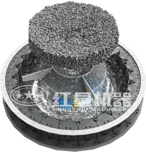 工作時(shí),將煤矸石原料由煤矸石制砂機(jī)葉輪上部分料器的中心入料管進(jìn)入葉輪的中心,再由葉輪中心的布料錐體將煤矸石物料均勻地分配到葉輪地各個(gè)發(fā)射流道,葉輪將煤矸石物料加速到70~100m/s的速度拋射出去,沖擊到渦動(dòng)破碎腔內(nèi)的礦石床層,進(jìn)行強(qiáng)烈地自粉碎。最后由煤矸石制砂機(jī)排料品排出。